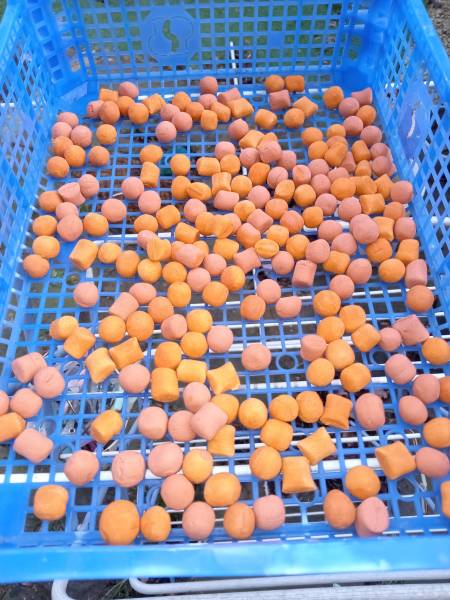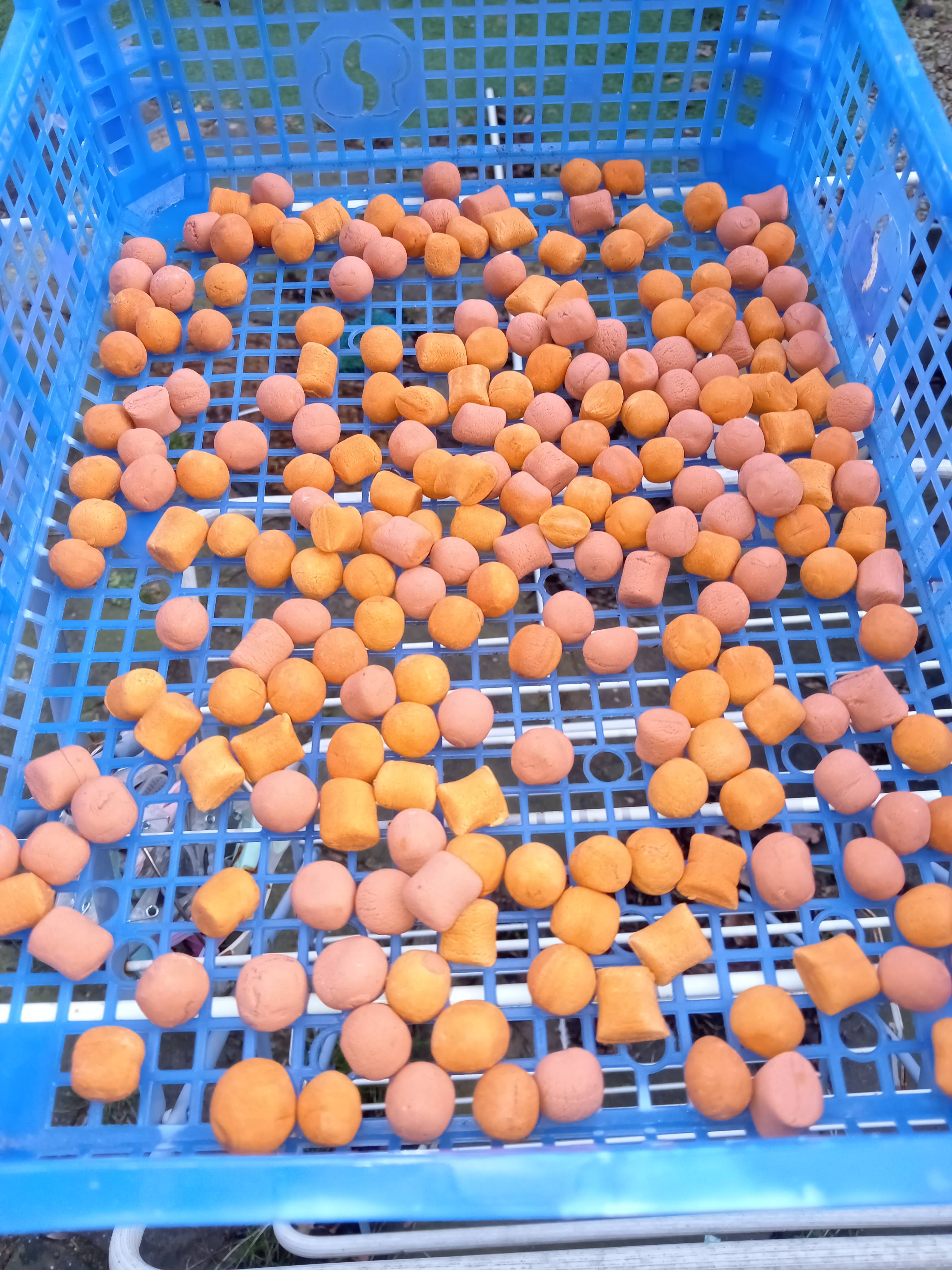 2. Made a couple of 1 egg mixes with the AA Baits super buoyant fishmeal pop up mix, my sausage gun was perfect the last couple of times but I think this mix just expanded a bit more, so the sausages came out a bit big and I ended up with some pillows and odd shapes, but never mind flavour wise they are pretty banging one is scopex, black pepper and bergamot and the orange ones are banana scopex, black pepper and bergamot. They are very buoyant though, and one is holding up my rig nicely next time I will make some matching wafters and I'll have made enough hookbaits to last a life time.