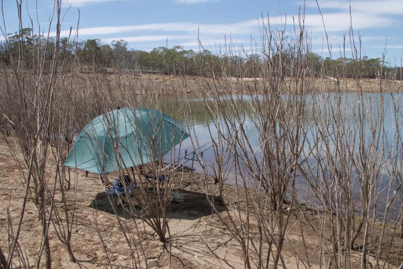 The only shade for miles is my brolly....carping in 40 degree heat can be thirsty work! Lake Eppaloch, Victoria.
