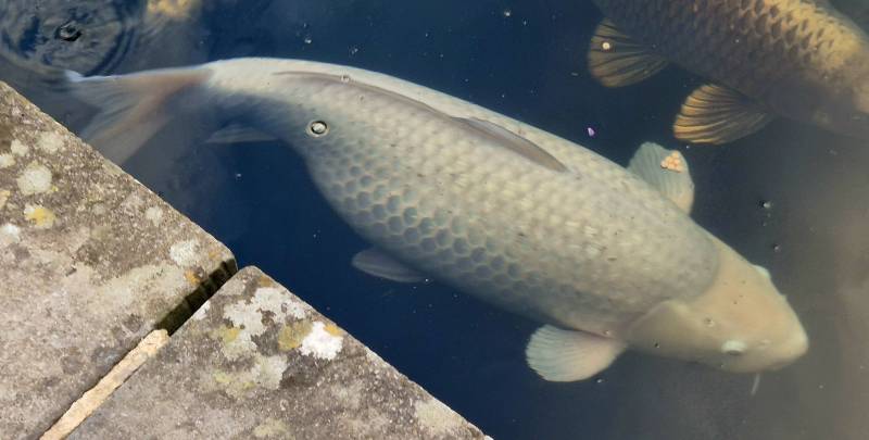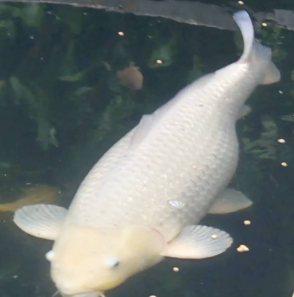 So I did my best to get shots on the phone - apologies for the poor quality. This fish is one of the bigger koi in the pond. It's a Gin Rin Platinum Ogon. Gin Rin meaning 'scaled' i.e. a common, Ogon meaning metallic, solid, single-coloured koi, and Platinum referring to the white/silver colour. In our carpy language it's basically a pure white common. The kids have named it 'Whopper', which imo is an absolutely rubbish name, but they love it so the name stays. I put Whopper at about 28 lb despite the local pond/koi expert being adamant she's a 30. Stick to your pond building mate... I know a 30 when I see one😅 Whopper is actually a young fish, possibly as young as 5 or 6, so if I want to grow a real monster (which obviously I do😅) she's probably my best bet in the shorter term. She's probably the most friendly fish too and will always be first up at feeding time. I'm taking it easy with the food at the moment due to dropping temps, but next year I'll up the feeding during growing season. Whopper should easily be 30lb by this time next year. I've taken a lot of advice on how to grow as safely and as naturally as possible. I don't want to heat the pond, I want the carp to have a 'natural' annual cycle, so I just need to optimise feeding at the right time.5 points