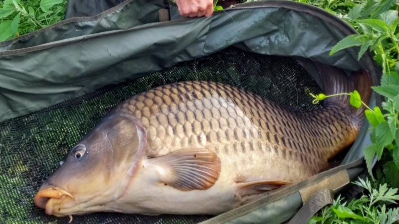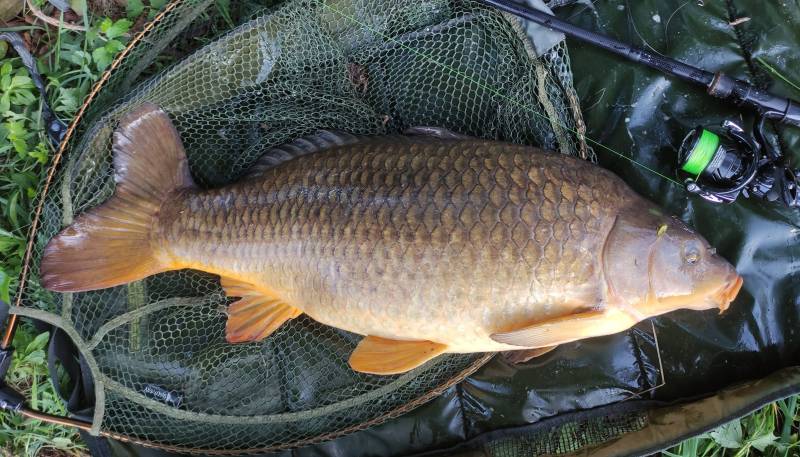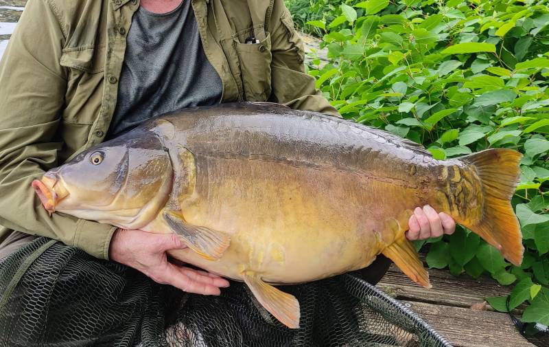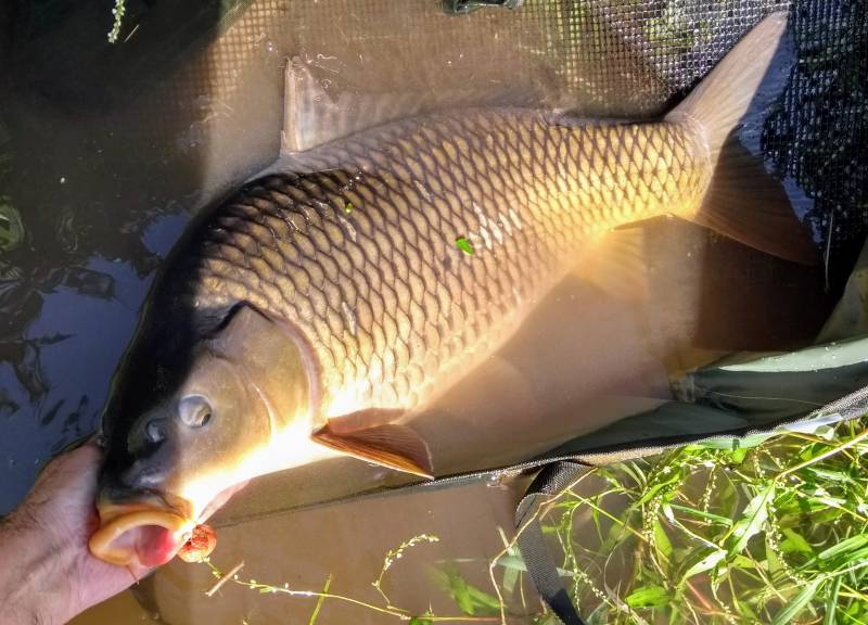 Well, it has been some time since I caught a carp! Summer drought conditions since mid-June and fishing has been a struggle. Very early morning sessions I managed a few barbel, mostly small. But I did have a couple of decent barbel just before the canicule heat spoiled my chances.... The weed growth did continue during the heatwave - both in the river and along the river banks. Long stretches covering my favourite swims solid with Japanese Knotweed making them unreachable! I lost three big carp over a couple of sessions due to the river weed. It made me rethink my hook-length and leader materials. Having made a few changes I tried again, my next mistake was telling my friend where I was fishing. He of course caught a 31 lb carp and a nice barbel - I blanked! But a few days later I noted some fresh flow in my local stretch, first for months. No idea where that came from! But I had a good idea where I might get a carp, unfortunately my friend came with me! This time I was determined to catch "MY" fish! had a couple of good knocks on the rod tip about 15 minutes after casting to my favourite tiny "hot-spot" where two currents converge over a slight depression. A little while later this great fish took off towards the opposite bank. A tremendous fight ensued, where the carp headed for every snag from boulders to sunken trees. My change of trace/leader material did its job and I got the carp to the net at the third attempt. Weighed over the water in the net, wet net deducted, gave a weight of 38.5 lbs. I had lost a couple from this swim in previous years so it was a great relief to finally get it right. Between the two of us we put the net across my thighs to protect the fish during the "trophy shot" moment. No time wasted the fish was back in the river and after a little rest it was away from the net. My tackle changes were not rocket science. I had to give up with mono, fluoro and uncoated braid and tried ESP tungsten loaded semi-stiff braid. Despite that fish going through the usual snags there was just one small area of coating damaged, the interior braid was still intact. That and changing my lead clip to a Korum type, it did its job and slipped the lead on the take. Oh, my fishing buddy blanked this time! 😂 -