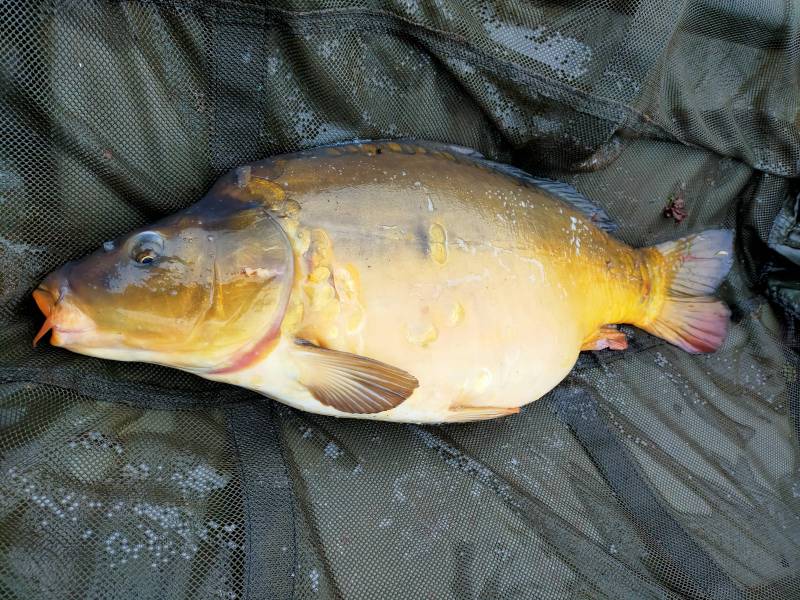 Here's my first fish of the year. Was -4 to start the session. Had a run, lifted into it but nothing on the end( thinking small fish with just bait in its mouth ). Then for the next few hours I could see my line pulling tight n slackening back off but not actually taking. Turns out pva wasn't melting (my mix of condensed milk and manilla being over cooked n like caramel stopping the PVA dissolving)(first time trying condensed milk). About 4pm I seen a fish show to the right of me, nowhere near where I was fishing so I quickly boshed a chod together and within 30mins, boom, fish on. Managed to land a 17.32 mirror saving me a blank. Not massive but always nice to get a winter carp