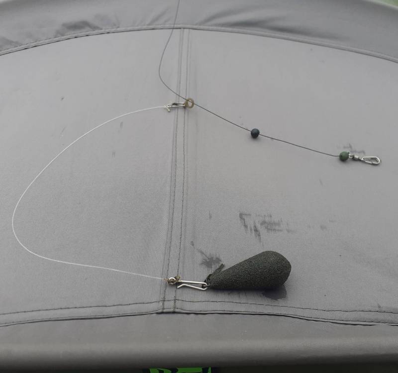 A coated braid, in this case Kryston Snakebite, line aligned with a short section around 10mm stripped back on a size6 Solar 101 hook, sliding ring on the hookshank, with a 4lb mono hair and a meshed mishape boilie. The rig ring means I can alter the hair length, in this case I found this gap was exactly right on the harder chalk lakebed.