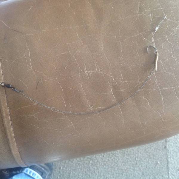 7. We have come a bit off topic of just rigs, but just as an example this is the rig, the exact rig, hook etc that caught me four fish from the reservoir. I have made the comment in the past about hook sharpness; if they aren't sharp enough out of the pack, then don't use them. Get a brand that is. You can see how much abuse that has taken as the coating on the braid has been well rubbed and the point no longer looks sharp. The hair was the stripped hooklink braid long enough for 2x 20mm boilies, straight out of the bait bucket fished hard on the bottom around bridge supports.