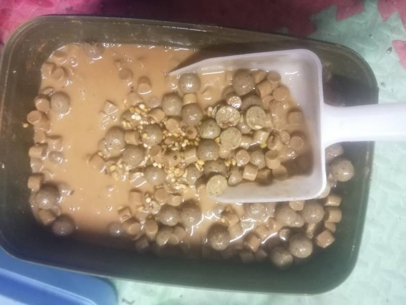 Spod mix prepping 😳 I've put some pellets and a kilo of boilies in now to soak up all the juice and go all mushy mmmmmm smelly garage now 😱