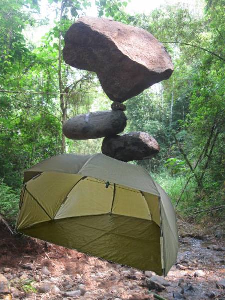 Trouble is I rarely use a brolly, so haven't developed a knack for using one (showing how dumb I am ). When I have used one, it's normally on plain simple mud where you can get pegs and stuff in.