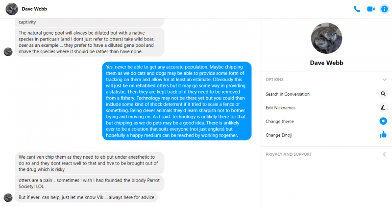 bit stupid to do it in front of people!! again, totally get the reasoning. I have zero respect for Dave Webb after speaking to him at length and him confirming to me that otter releases, although not condoned by the UKWOT still happen and release sites have never been recorded or selected on potential impact to fishery businesses, and the bit that made me lose his respect further, is that he doesnt support changing the release system. As much as he says he wants to help fisheries, he doesnt, he is against them and couldnt give a monkeys. The way he casually says a 30k fence is worth it for a fishery as if they have that kind of dough knocking about spare. He's an idiot and I really really hope a judge somewhere, one day, allows a fishery owner who cannot erect fencing for whatever reason to shoot otters just to see the look on his face.